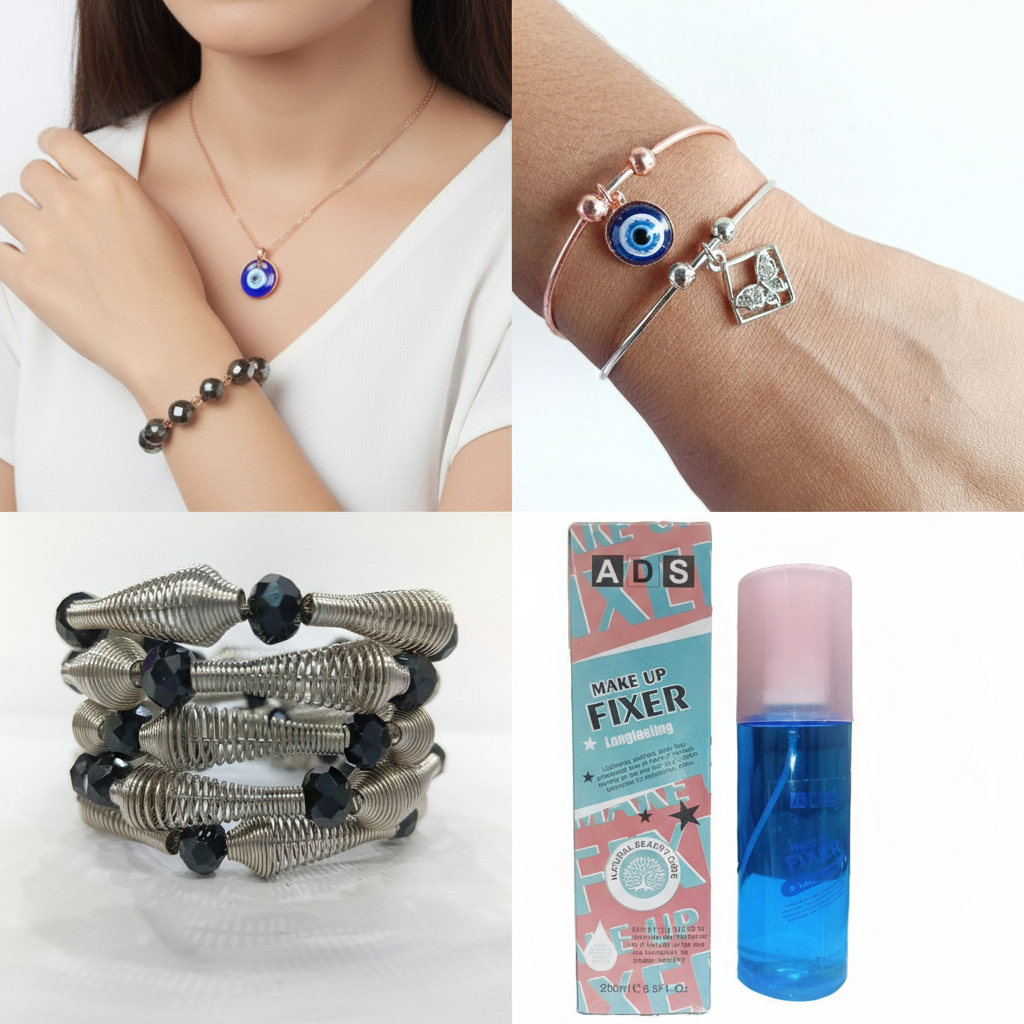 Rose Gold Evil Eye Necklace and Black Gemstone Bracelet Set